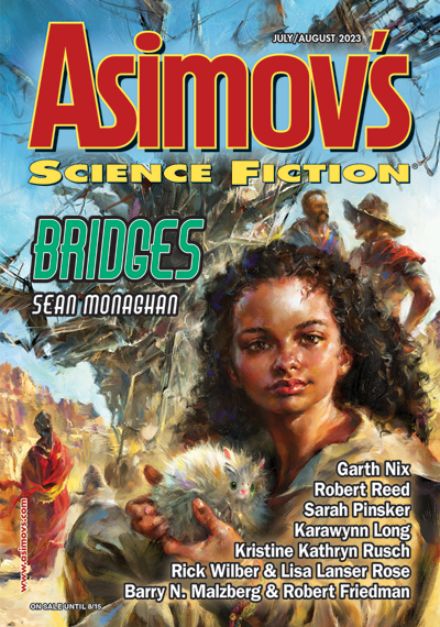 Nix offers up a very detailed sandbox to play in, and that ends up being a double-edged sword. As fun as the setting and backstory can be, for the first two-thirds of the novelette the characters can hardly take a step or get off a line of dialogue without the author digressing into several paragraphs of exposition. The story is nearly half-finished before the main conflict is even established. This has the unfortunate effect of making the promised “showdown” feel somewhat hasty in its execution. Uncia and Onca are nicely delineated characters, though, and their relationship allows for a satisfyingly tender conclusion.